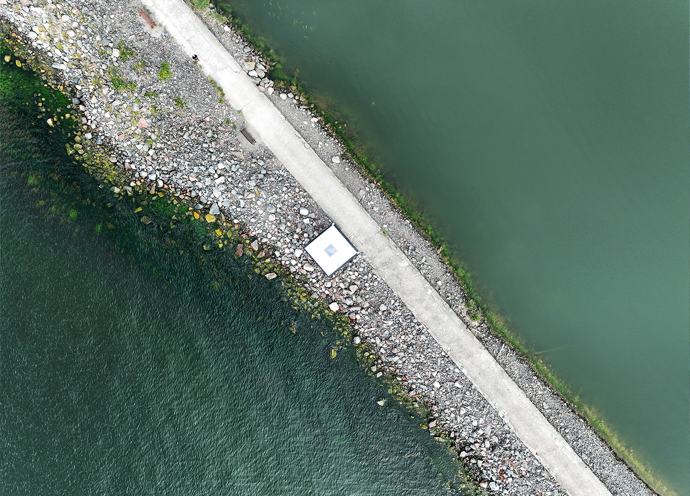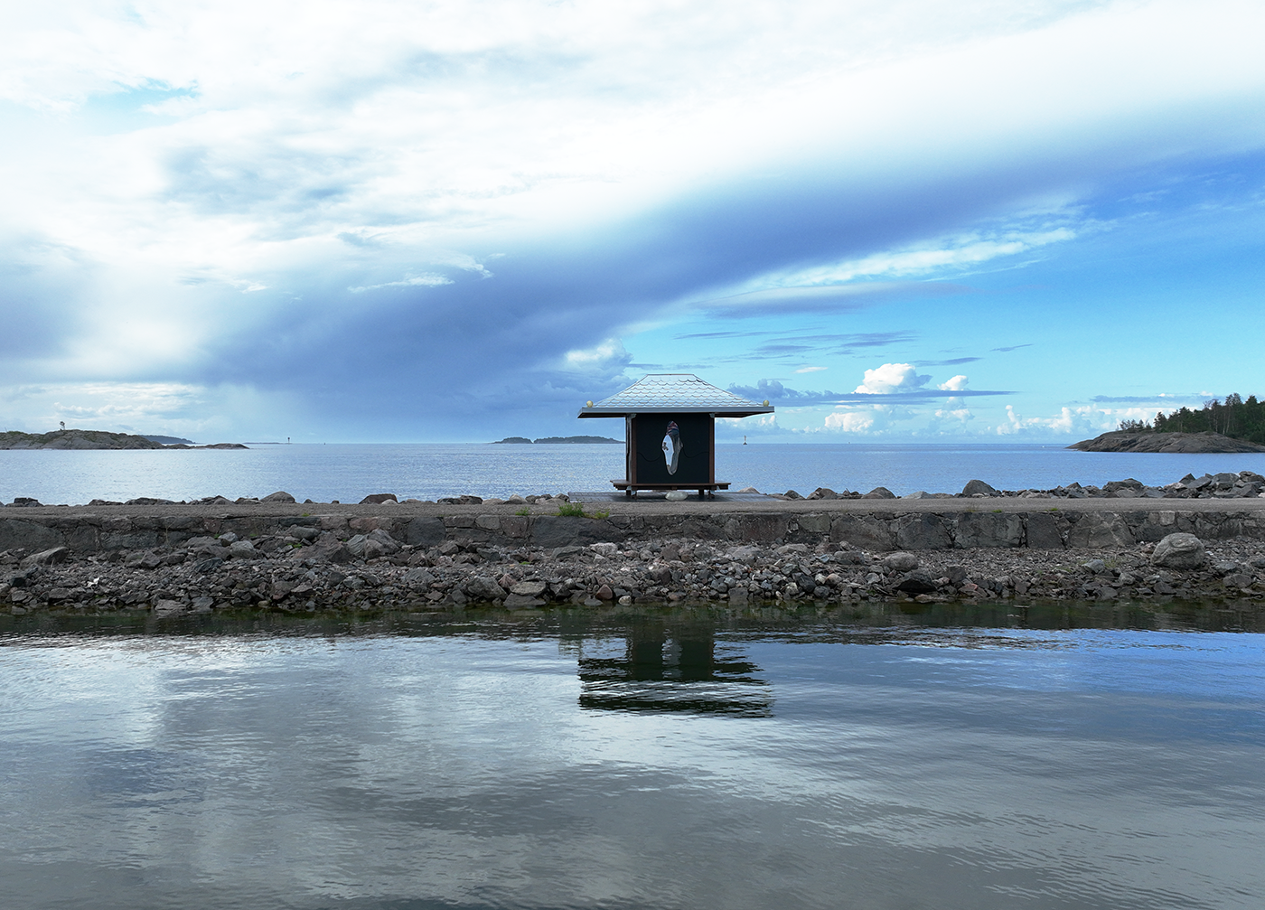 Visitors arrive on the island by boat and find the pavilion located at the end of the trail that spans the Biennial. The work is in the middle of a path that connects two islands together and is where two seas meet. As visitors make their way towards the Spirit House, and before it is in their full view, the sun reflects and shimmers the mirrored roof from afar. At the Spirit House, there are four windows, three of which visitors can open and peek into a portal of 3D sculptures suspended in the air and a 3D printed landscape with spirit creatures atop. Visitors can also sit around the circumference of the Spirit House and enjoy the natural surroundings. Gentle sounds of chimes fade in and out on occasion.